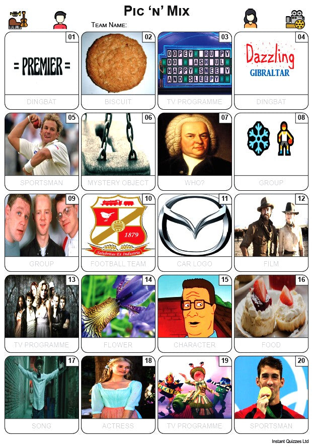 In this mixed-bag picture quiz, teams need to identify a variety of images including, Faces, Mystery Objects, Films, Food and many more... using clues provided belowe each picture!