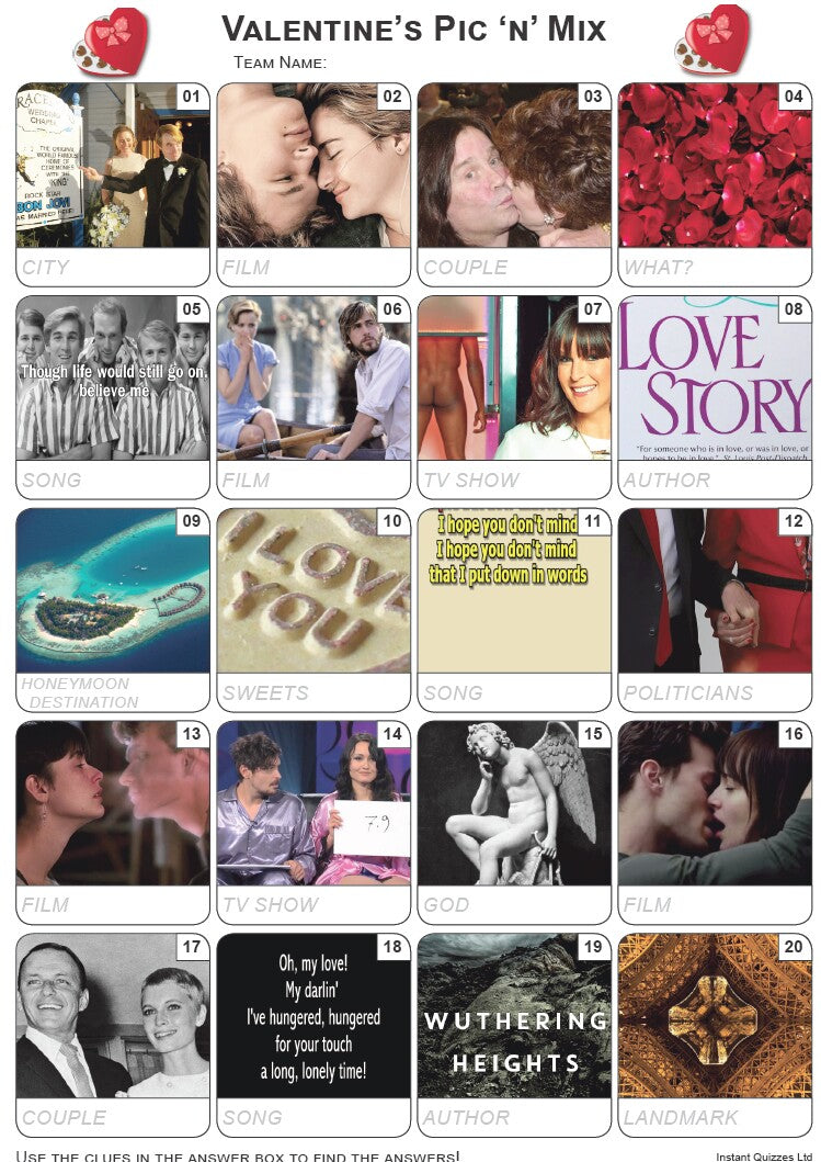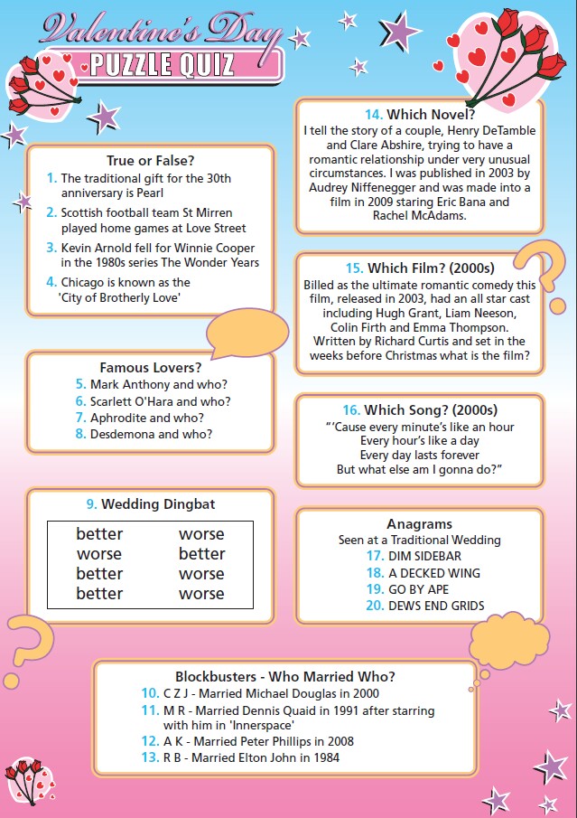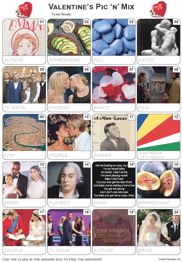 In this section you will find Quiz Packs, Handout Quizzes, Quiz Questions and Picture Rounds about love, marriage and lovers