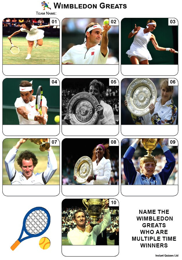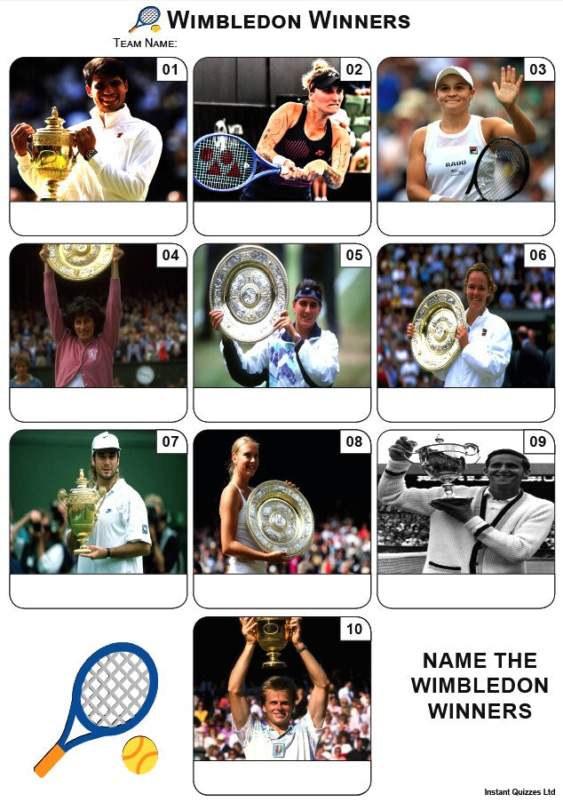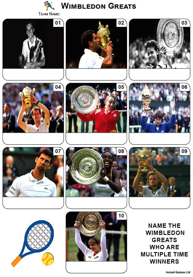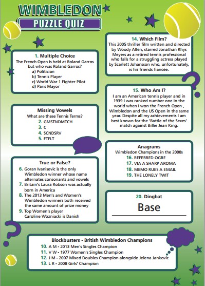 Ideal for a themed Wimbledon or Sports quiz night, or to be used as part of a hotel, office or Wimbledon party or festive competition
